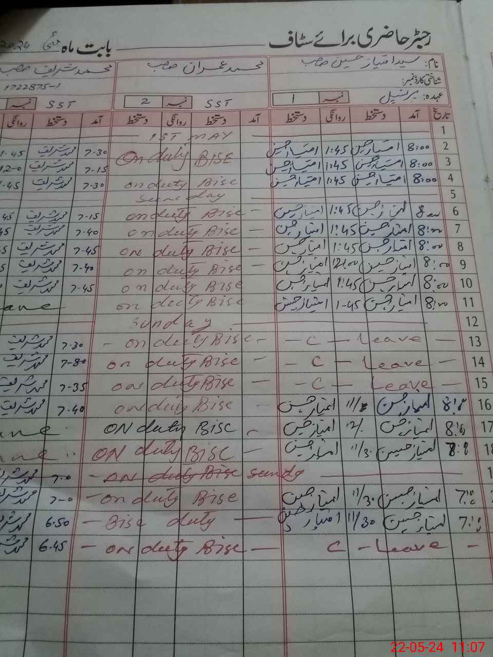 | CNIC | Full Name | Designation | R/C | Absence During Last Calender Month |