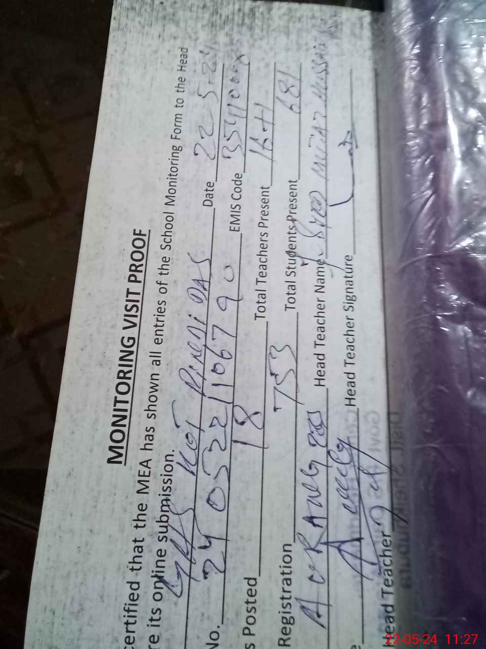 | Attendance Register | Head Teacher | MEA with School | Visit Proof |