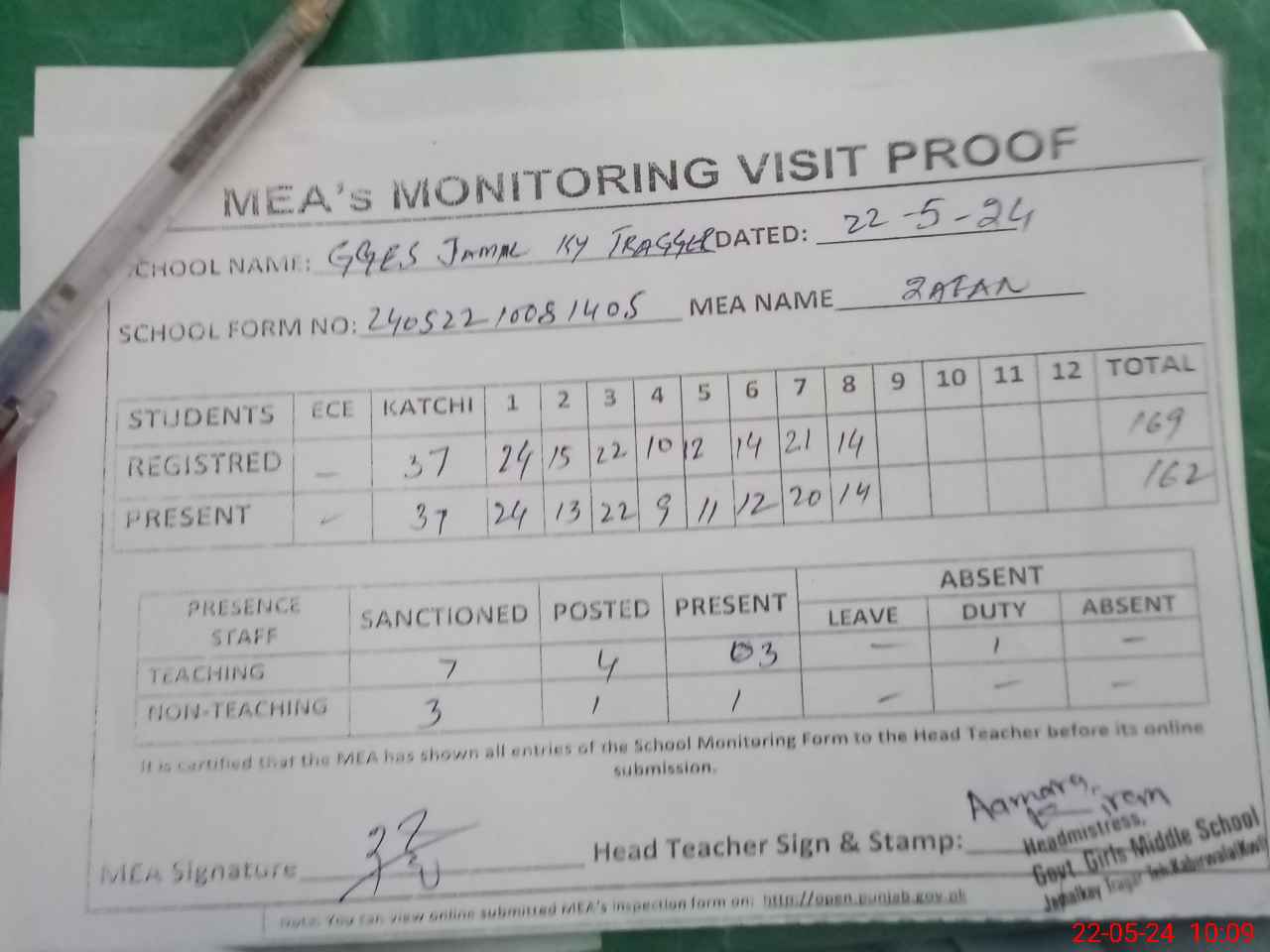 | Attendance Register | Head Teacher | MEA with School | Visit Proof |
