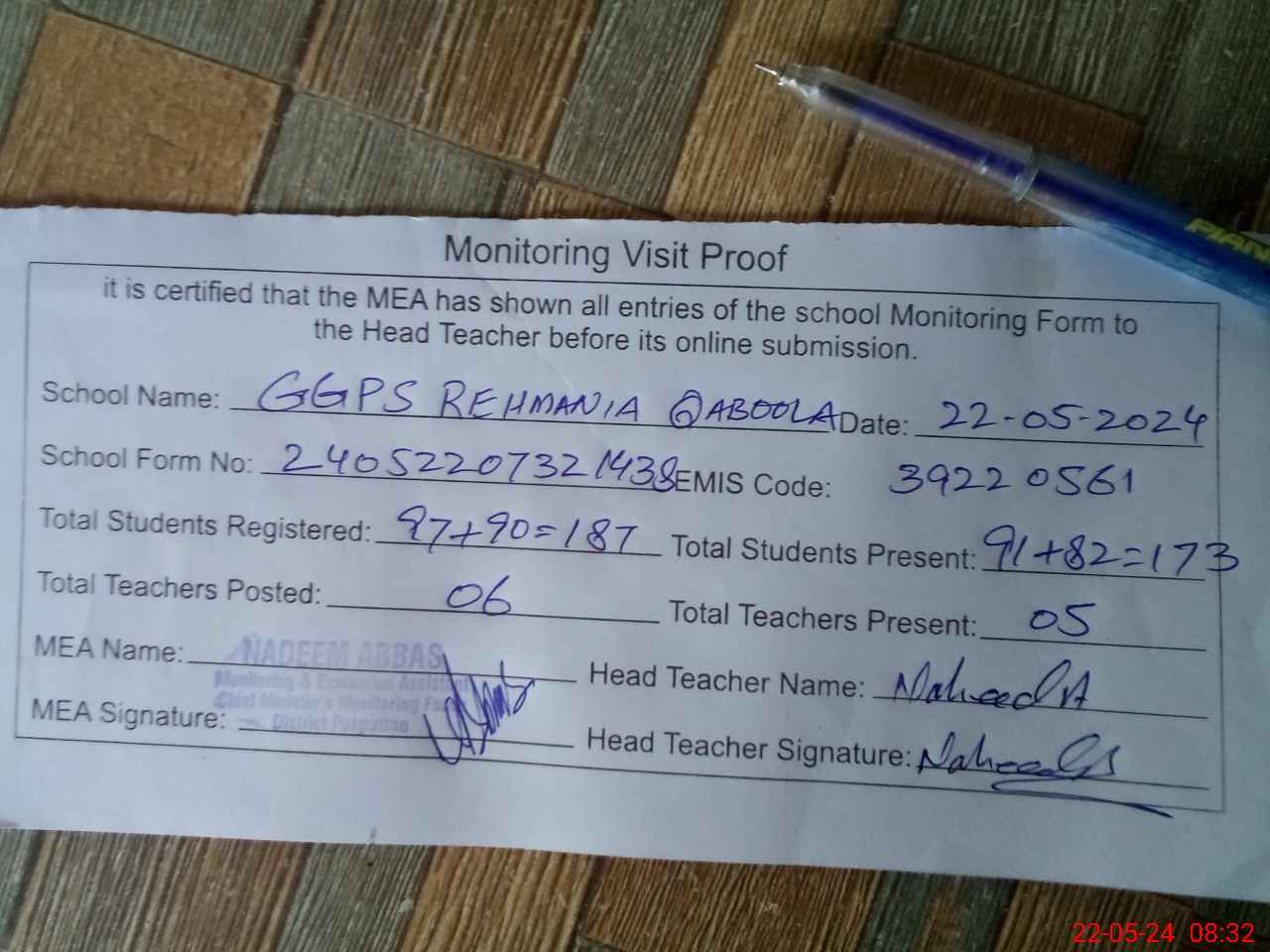 | EMIS Code: 39220561 | Name of School: GGPS REHMANIA QABOOLA | |||