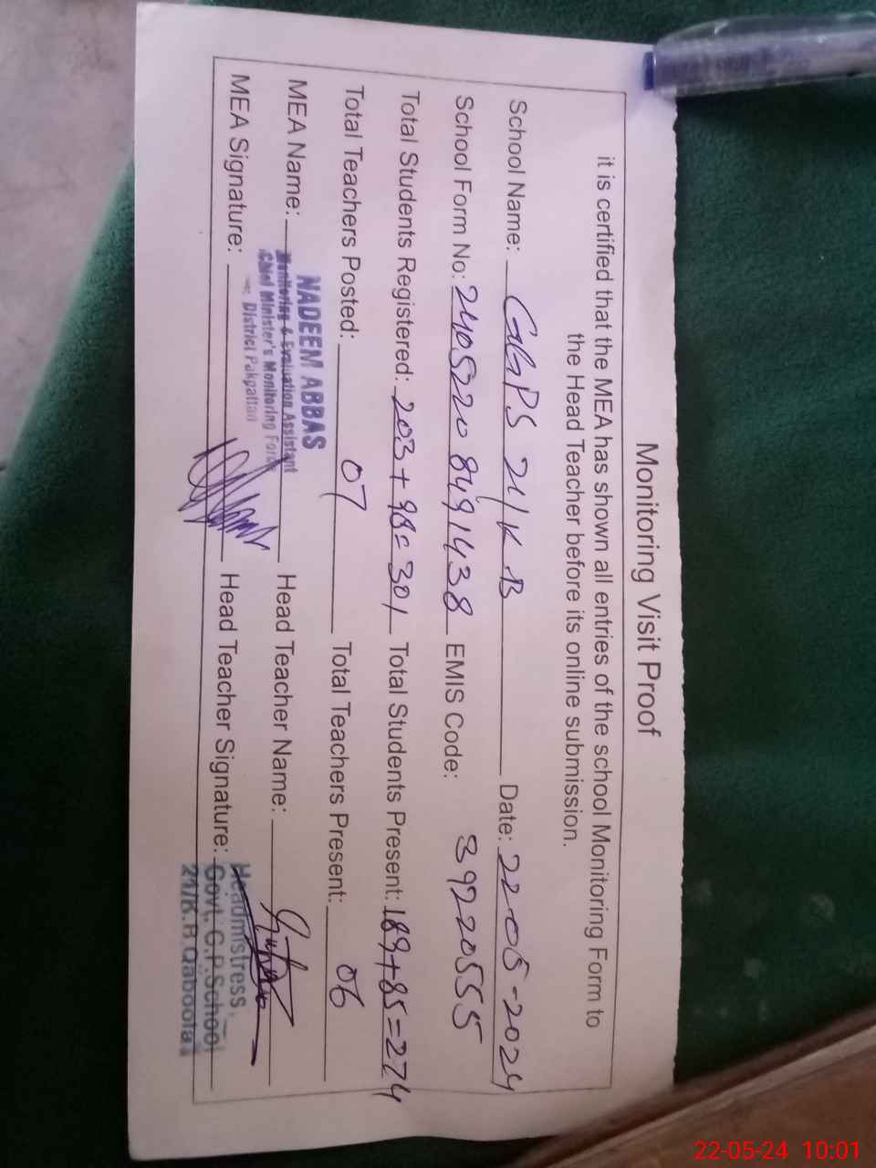 | Name: GU**** IS**** Designation: (School Headmaster's/Headmistress's) PST Phone/Cell Number: 03**** |