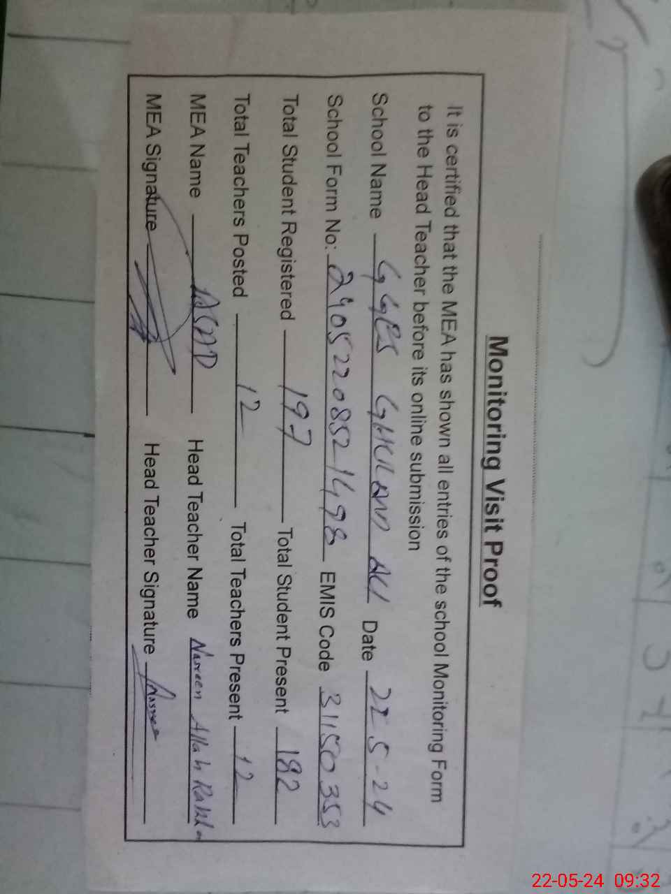 | Attendance Register | Head Teacher | MEA with School | Visit Proof |