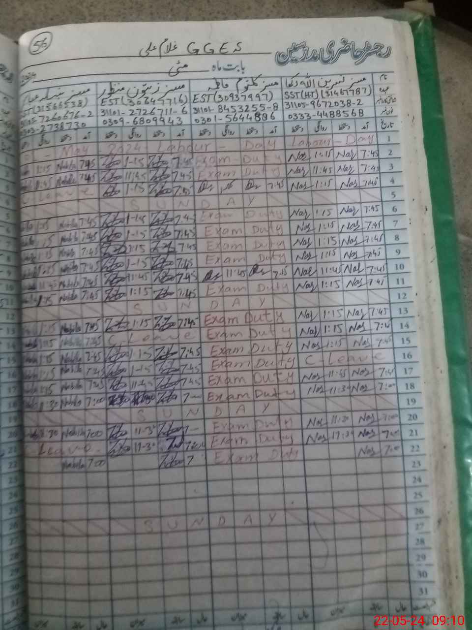 | 31**** | Ta**** Ya**** | EST | Regular | 0 | 0 | 0 | 0 | 0 | 0 | 0 | 0 | 0 | Exam Duty |