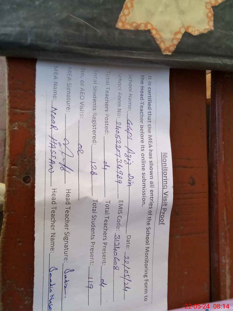 | Certified that this School was Inspected by the Undersigned MEA/DMO Today and the Information Stated Above is as Per Record. | |||||