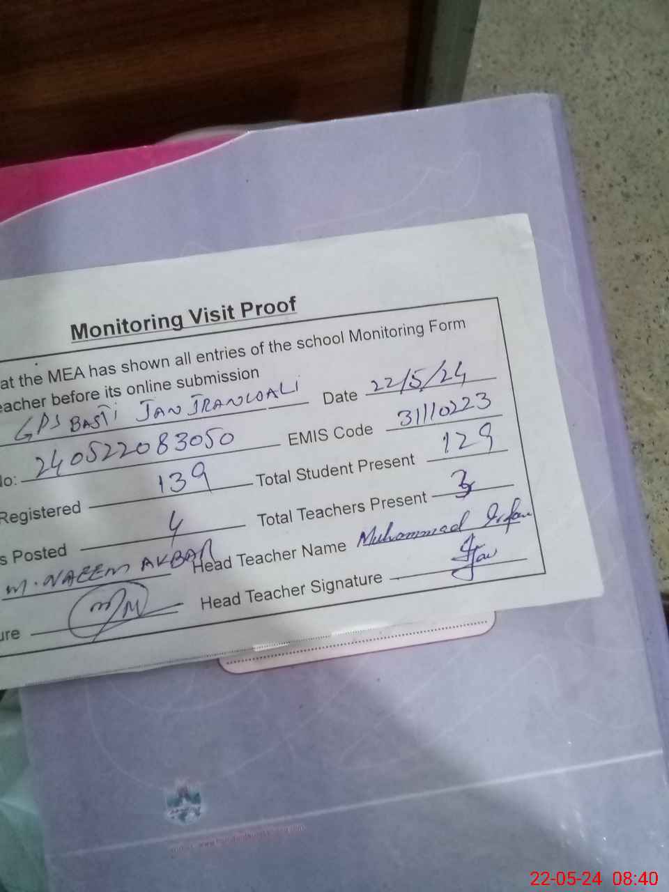 | Attendance Register | Head Teacher | MEA with School | Visit Proof |