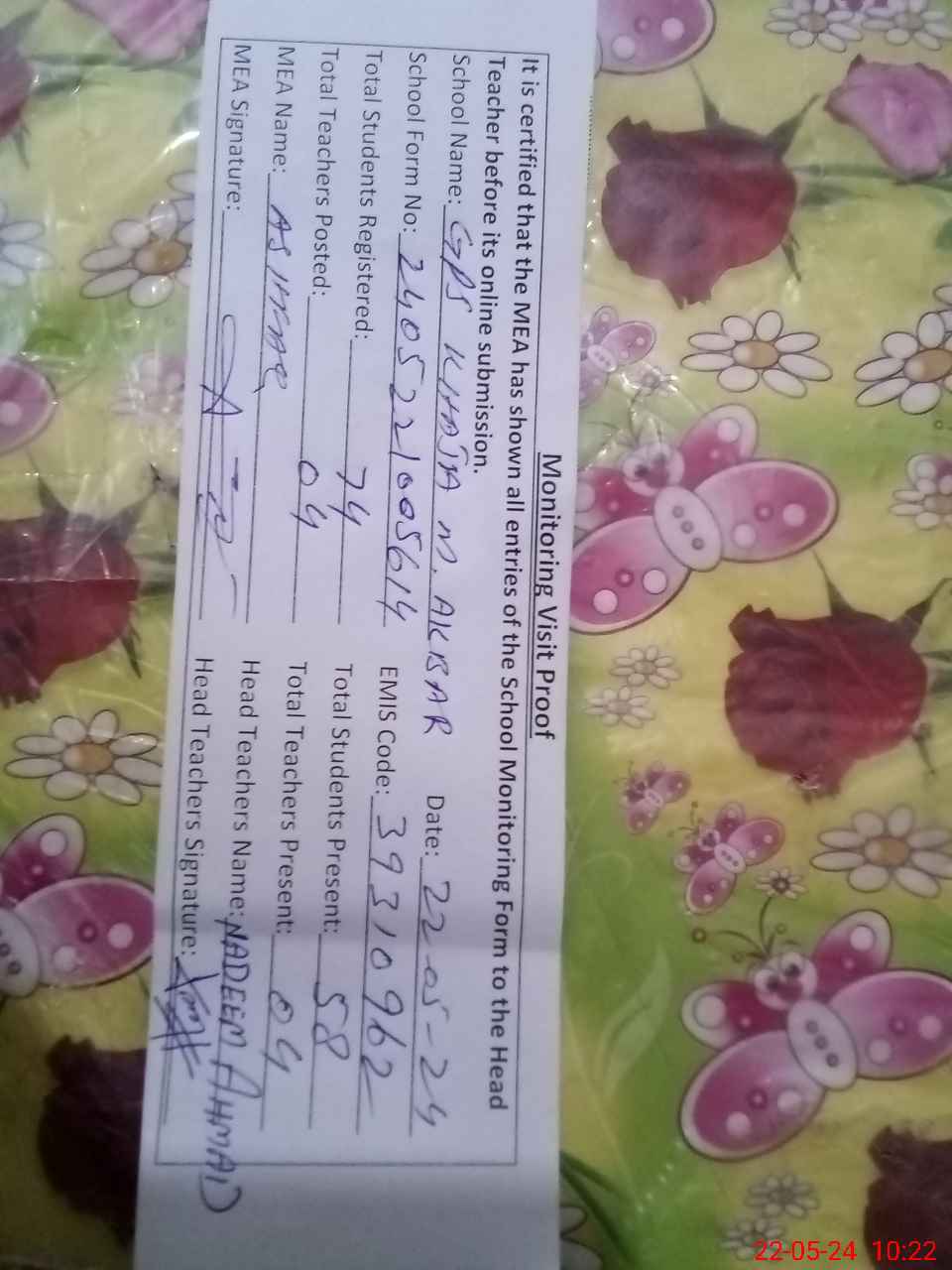 | Certified that this School was Inspected by the Undersigned MEA/DMO Today and the Information Stated Above is as Per Record. | |||||