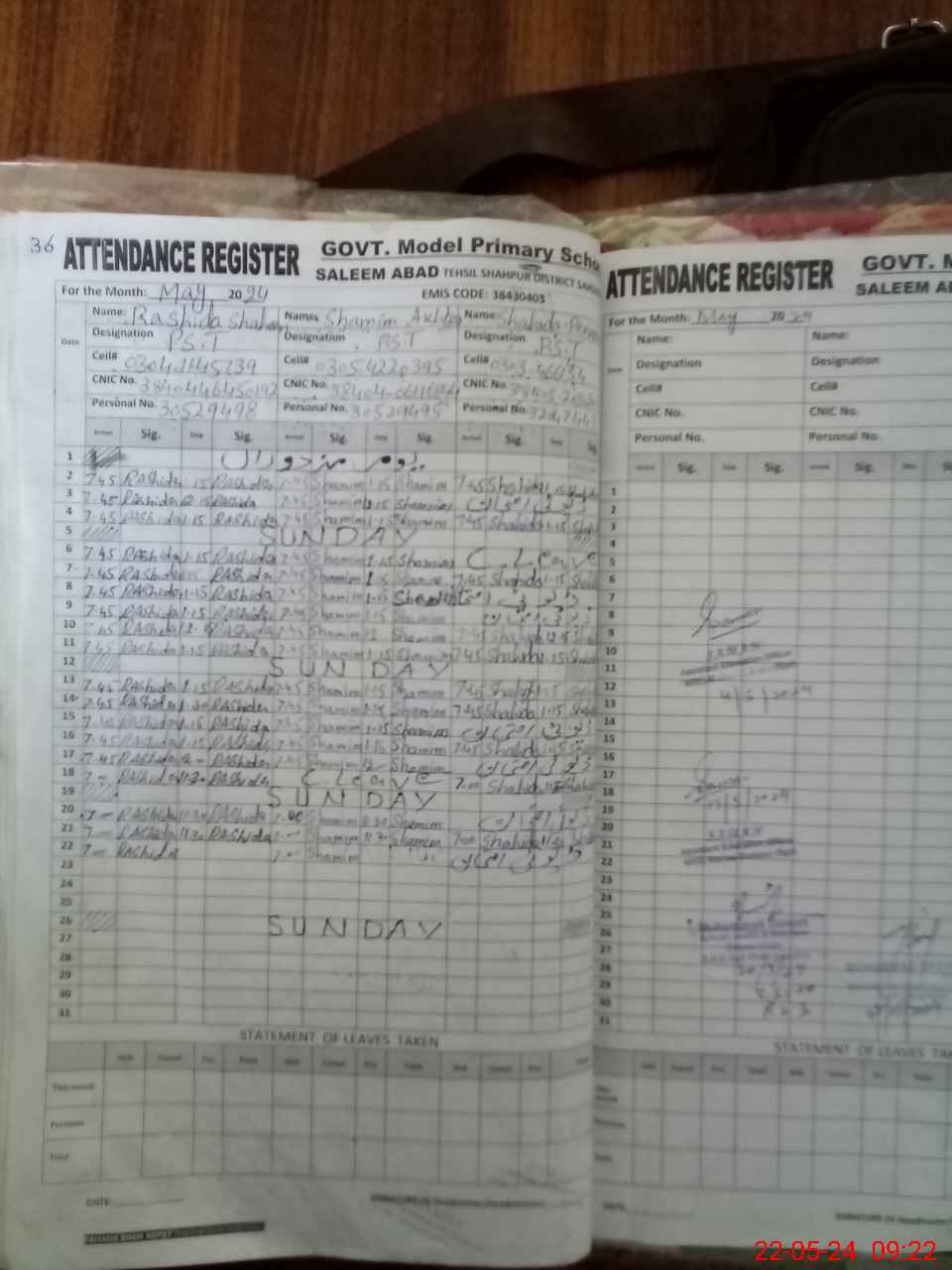 | CNIC | Full Name | Designation | R/C | Absence During Last Calender Month |