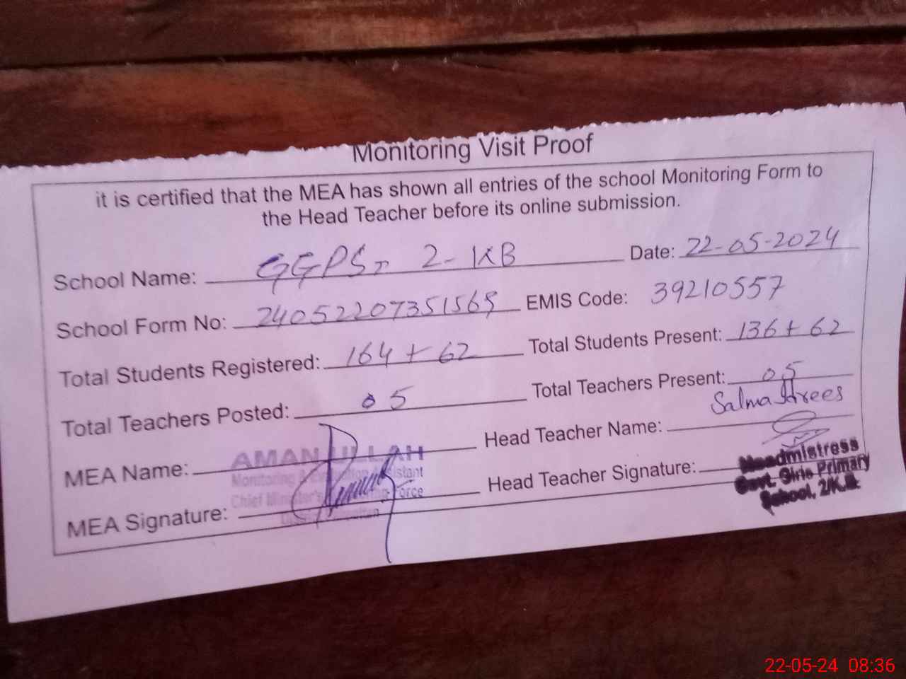 | Attendance Register | Head Teacher | MEA with School | Visit Proof |