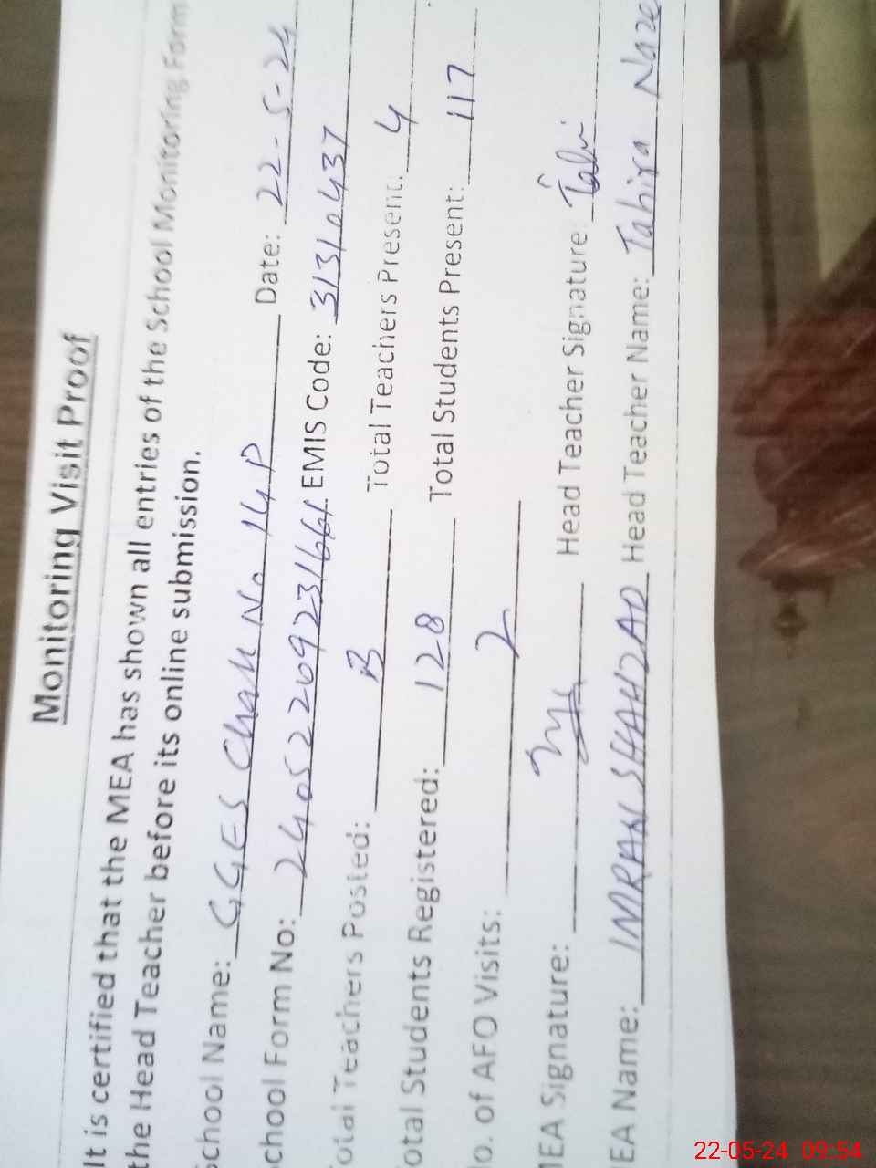 | Attendance Register | Head Teacher | MEA with School | Visit Proof |
