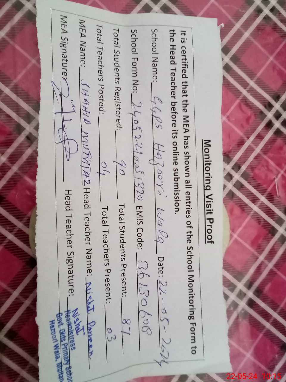 | Certified that this School was Inspected by the Undersigned MEA/DMO Today and the Information Stated Above is as Per Record. | |||||