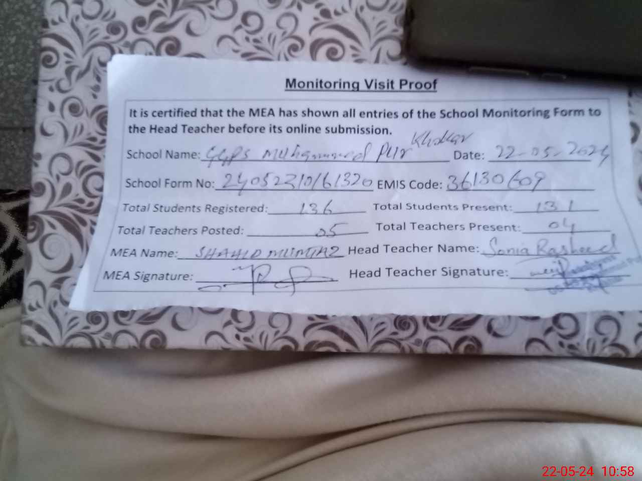 | Attendance Register | Head Teacher | MEA with School | Visit Proof |