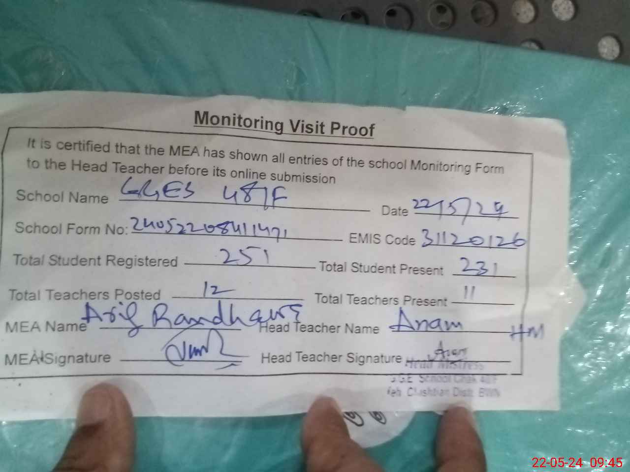 | Attendance Register | Head Teacher | MEA with School | Visit Proof |
