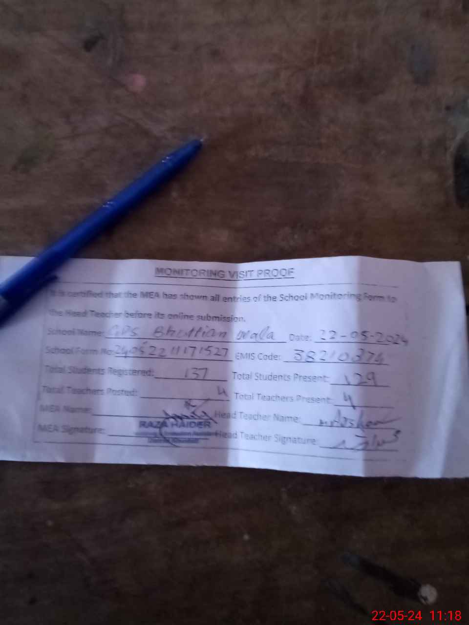 | Attendance Register | Head Teacher | MEA with School | Visit Proof |