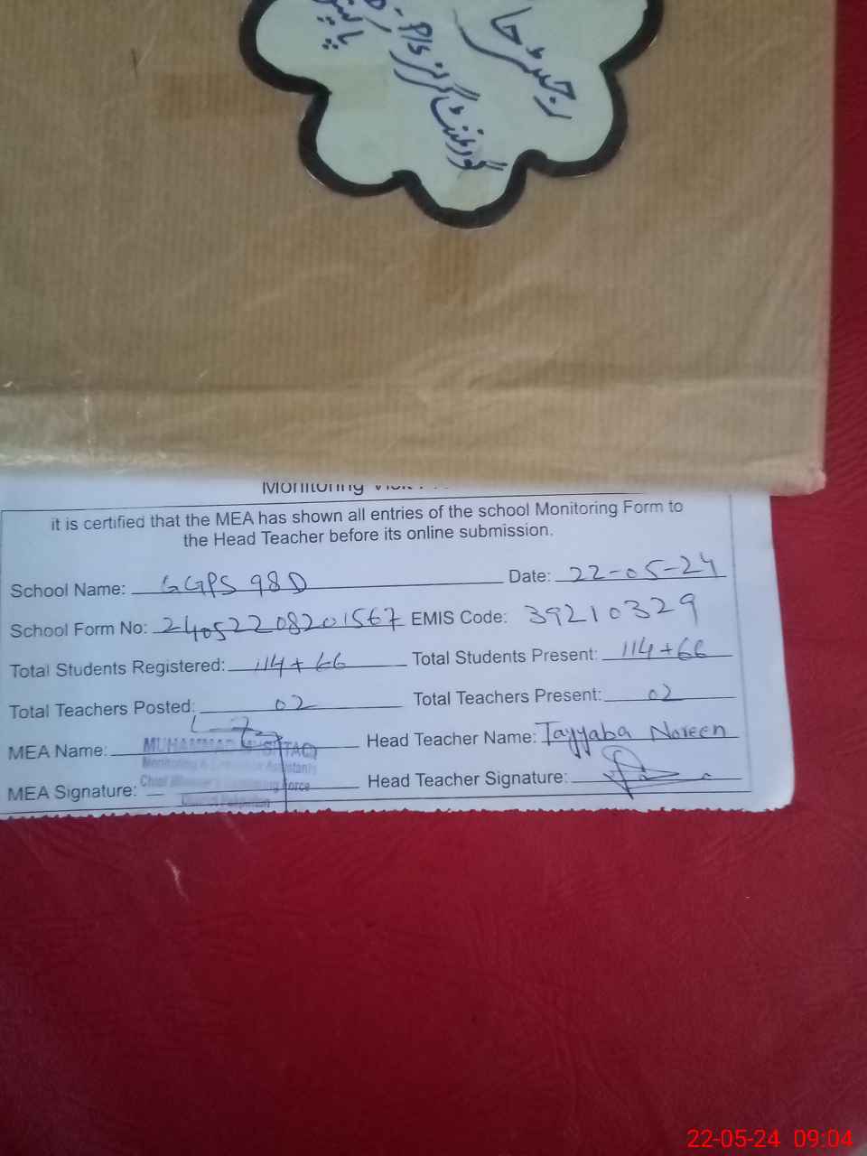 | Attendance Register | Head Teacher | MEA with School | Visit Proof |