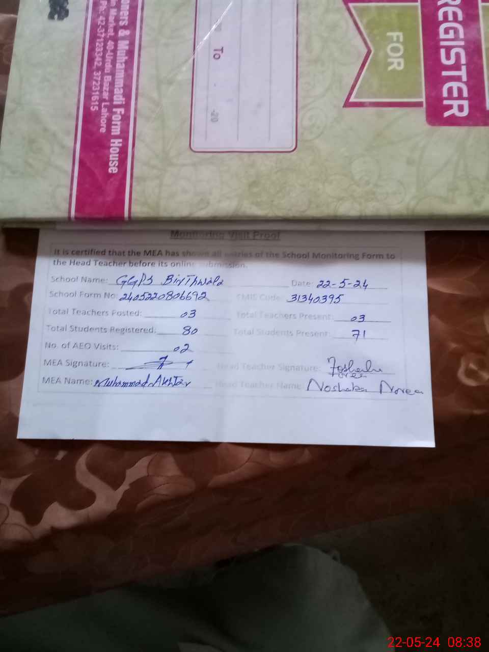 | Attendance Register | Head Teacher | MEA with School | Visit Proof |