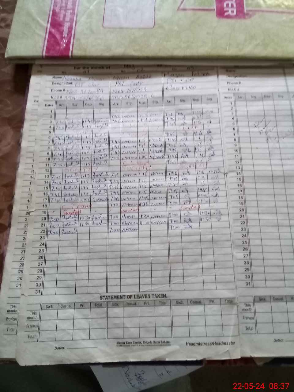 | CNIC | Full Name | Designation | R/C | Absence During Last Calender Month |