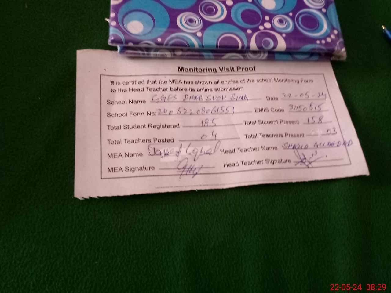 | Attendance Register | Head Teacher | MEA with School | Visit Proof |