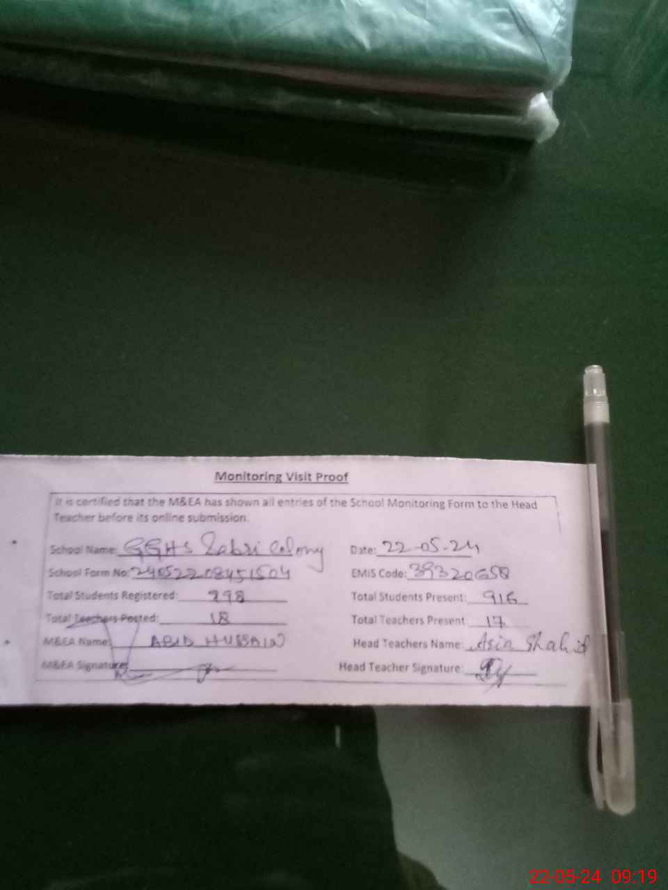 | Attendance Register | Head Teacher | MEA with School | Visit Proof |