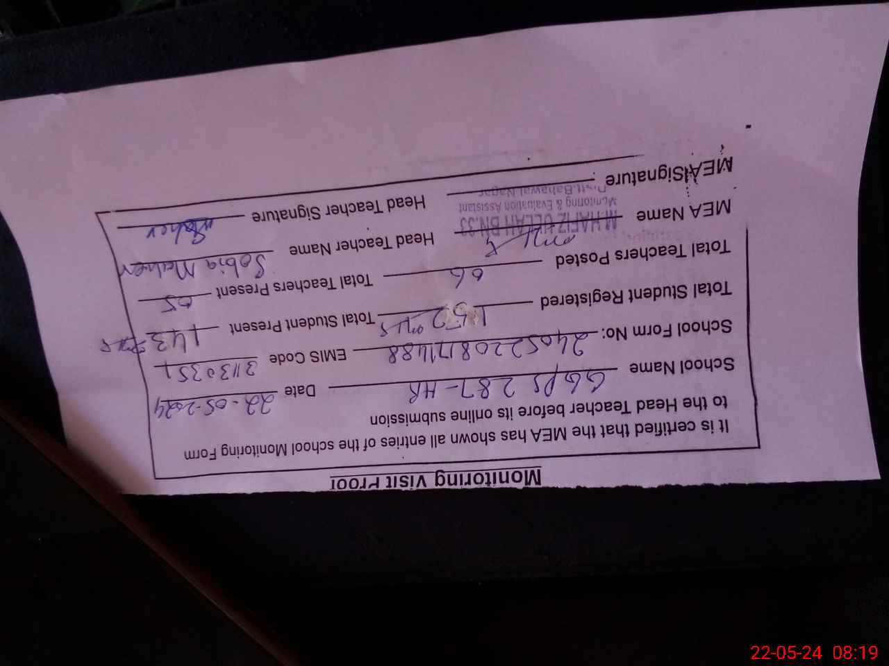 | Certified that this School was Inspected by the Undersigned MEA/DMO Today and the Information Stated Above is as Per Record. | |||||