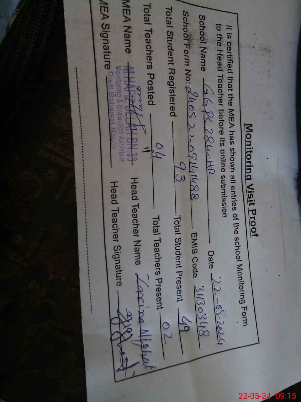 | Name: Za**** Ni**** Designation: (School Headmaster's/Headmistress's) EST Phone/Cell Number: 03**** |