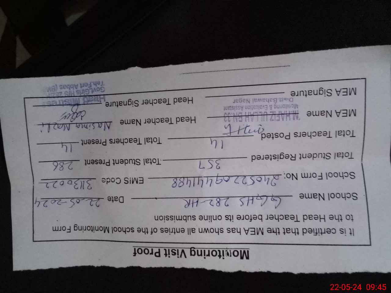| Monitoring Date: 22-05-2024 | Start Time: 22-05-2024 09:28 AM | End Time: 22-05-2024 09:47 AM | Name of MEA: Mu**** Ha**** BN**** | |
