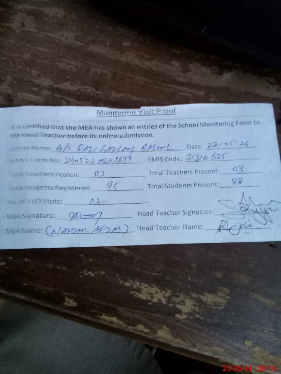 | Monitoring Date: 22-05-2024 | Start Time: 22-05-2024 07:45 AM | End Time: 22-05-2024 08:16 AM | Name of MEA: Na**** Af**** | |