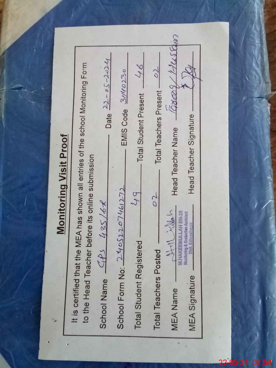| Attendance Register | Head Teacher | MEA with School | Visit Proof |