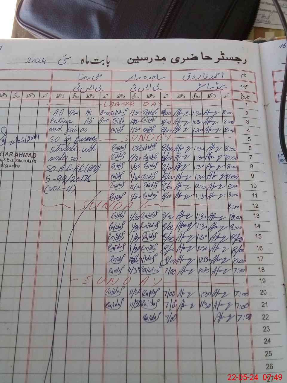 | CNIC | Full Name | Designation | R/C | Absence During Last Calender Month |