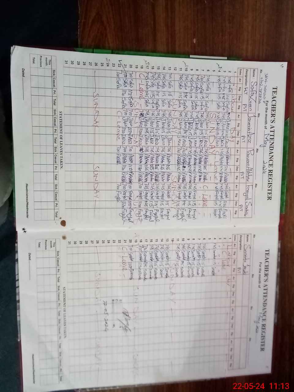 | CNIC | Full Name | Designation | R/C | Absence During Last Calender Month |