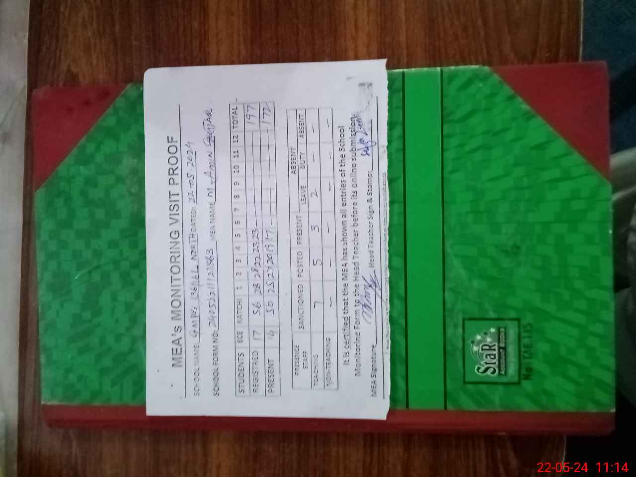 | Attendance Register | Head Teacher | MEA with School | Visit Proof |