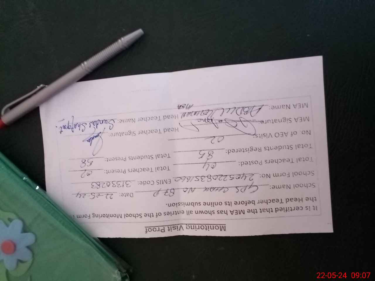 | Attendance Register | Head Teacher | MEA with School | Visit Proof |