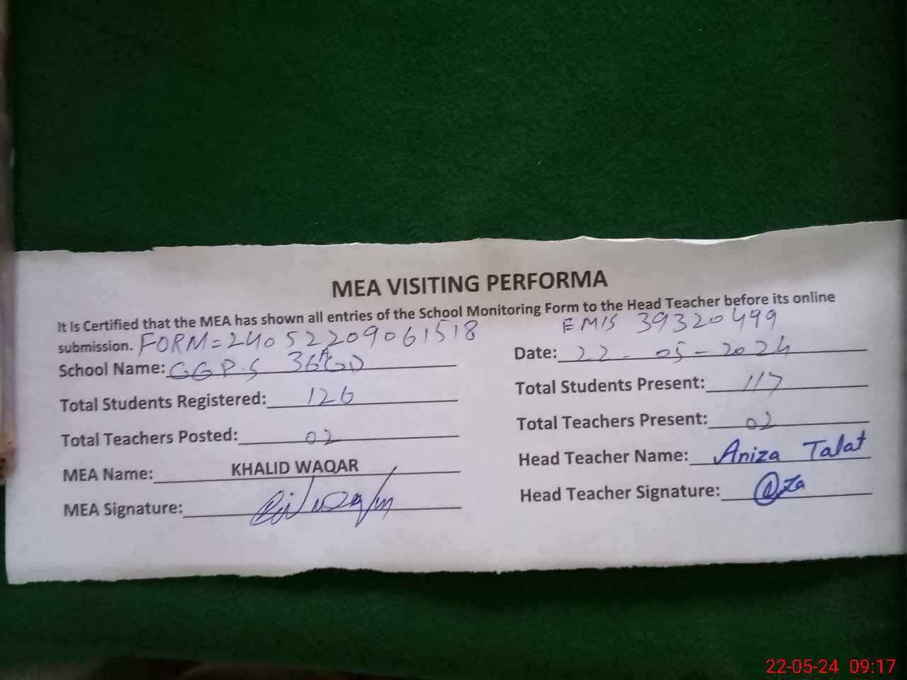 | Certified that this School was Inspected by the Undersigned MEA/DMO Today and the Information Stated Above is as Per Record. | |||||