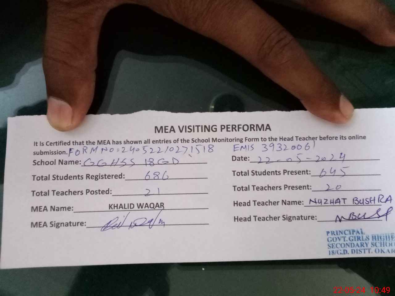 | Certified that this School was Inspected by the Undersigned MEA/DMO Today and the Information Stated Above is as Per Record. | |||||