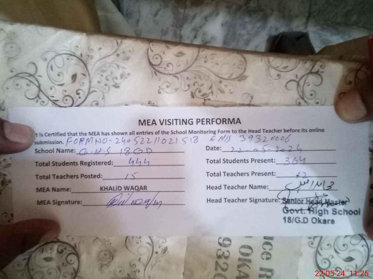 | Certified that this School was Inspected by the Undersigned MEA/DMO Today and the Information Stated Above is as Per Record. | |||||