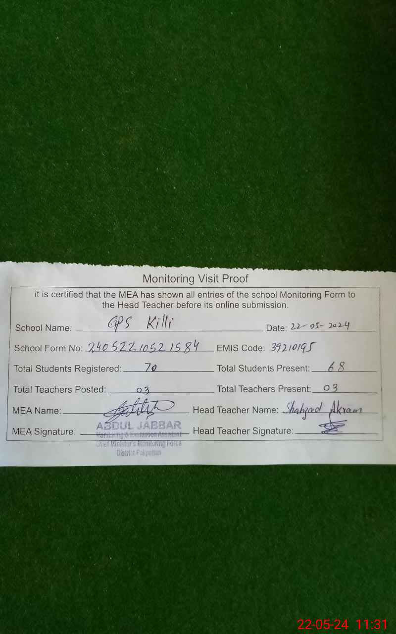 | EMIS Code: 39210195 | Name of School: GPS KILLI PO PAKPATTAN | |||