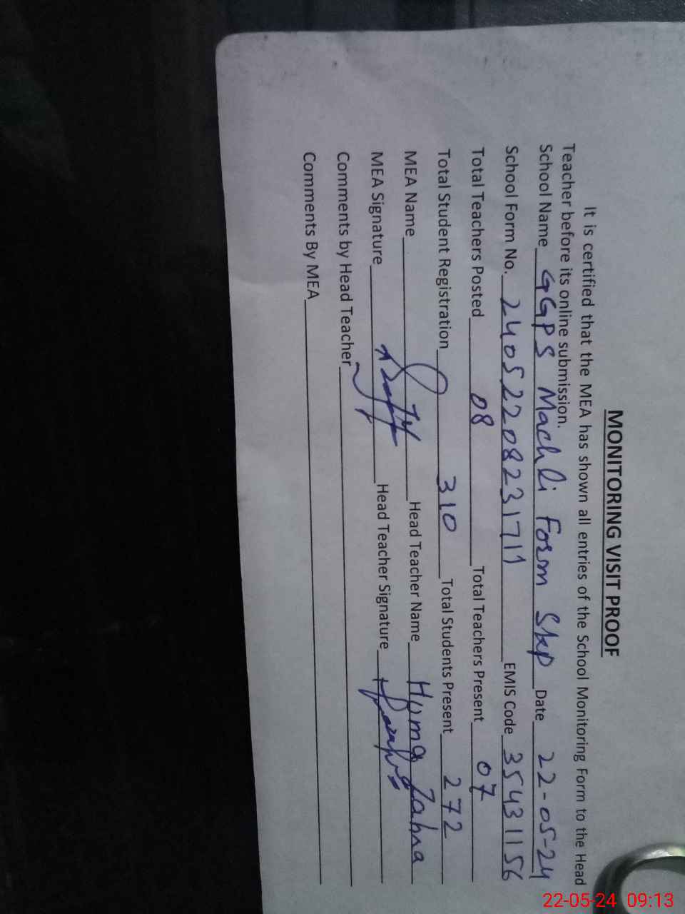 | Attendance Register | Head Teacher | MEA with School | Visit Proof |