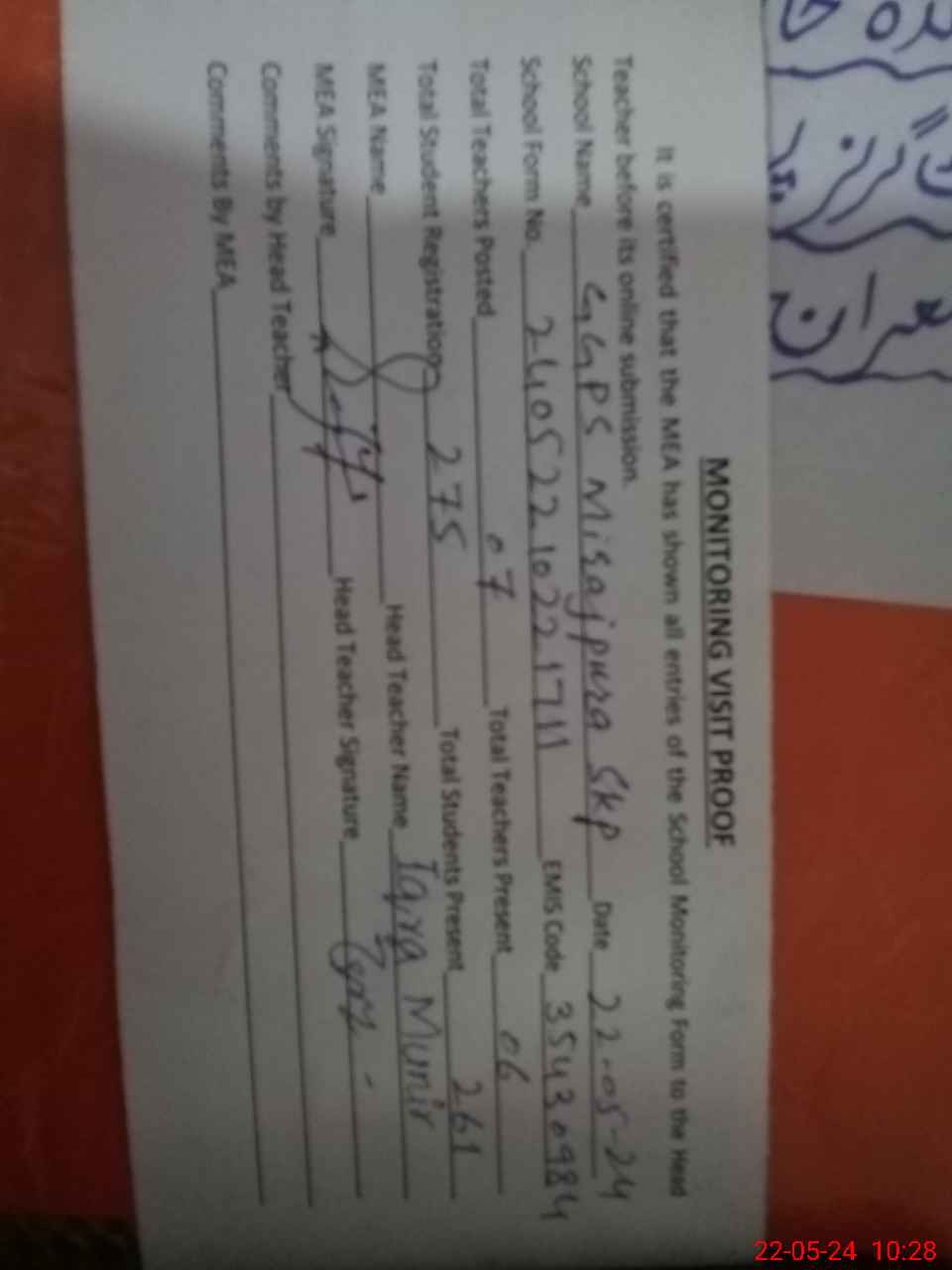 | Certified that this School was Inspected by the Undersigned MEA/DMO Today and the Information Stated Above is as Per Record. | |||||