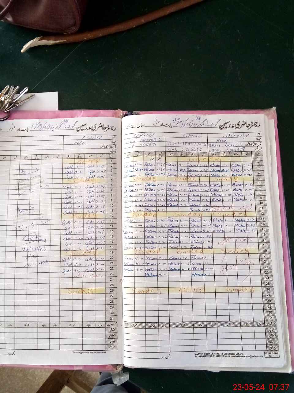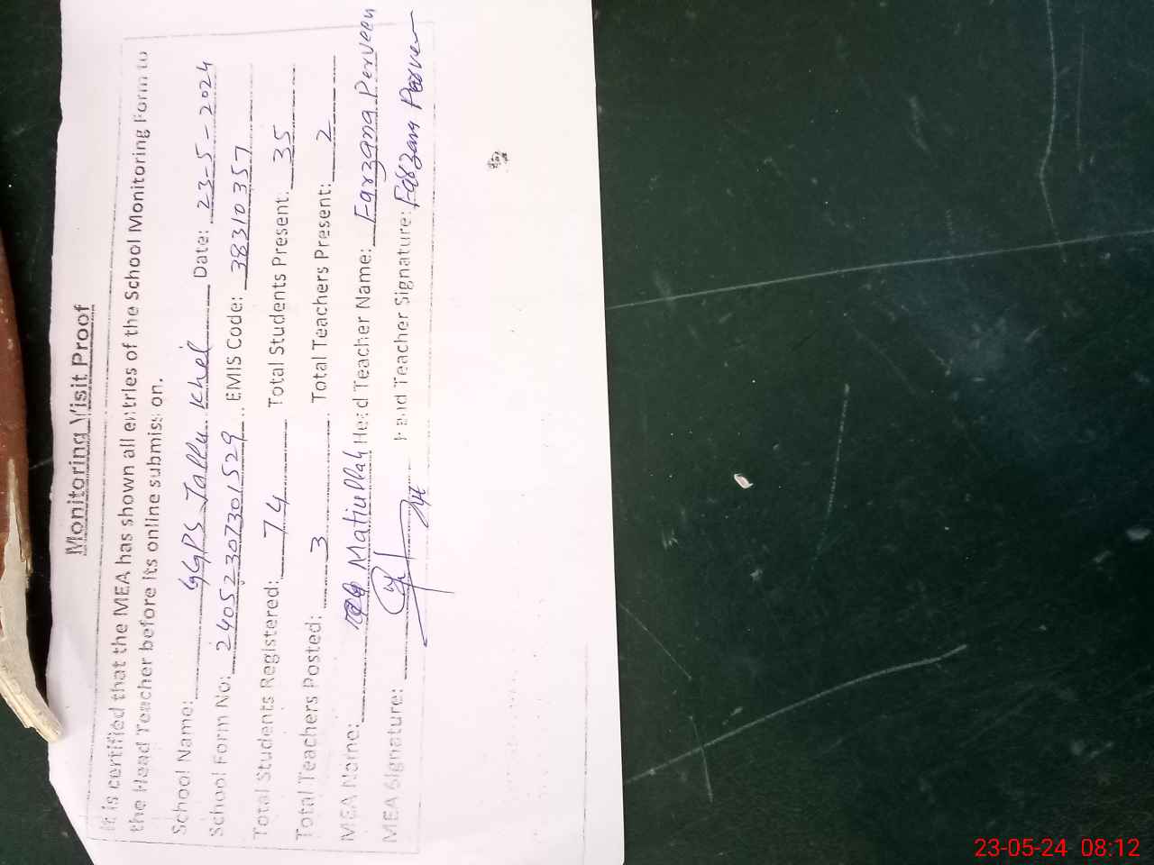 | Total no. of Classrooms: 2 No. of Classrooms Used for Teaching: 2 No. of Classrooms Storing Old Furniture, FTBs, etc: 0Comments if Any: All classes students names on attendance register with led pencil moreover no tablet available in school for verification inrolement school head recommend leave heard copy available soap not available basen found broken chokedar Muhammad Latif recomm |