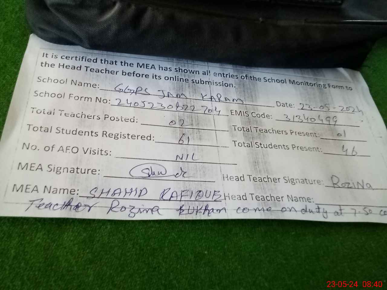 | Attendance Register | Head Teacher | MEA with School | Visit Proof |
