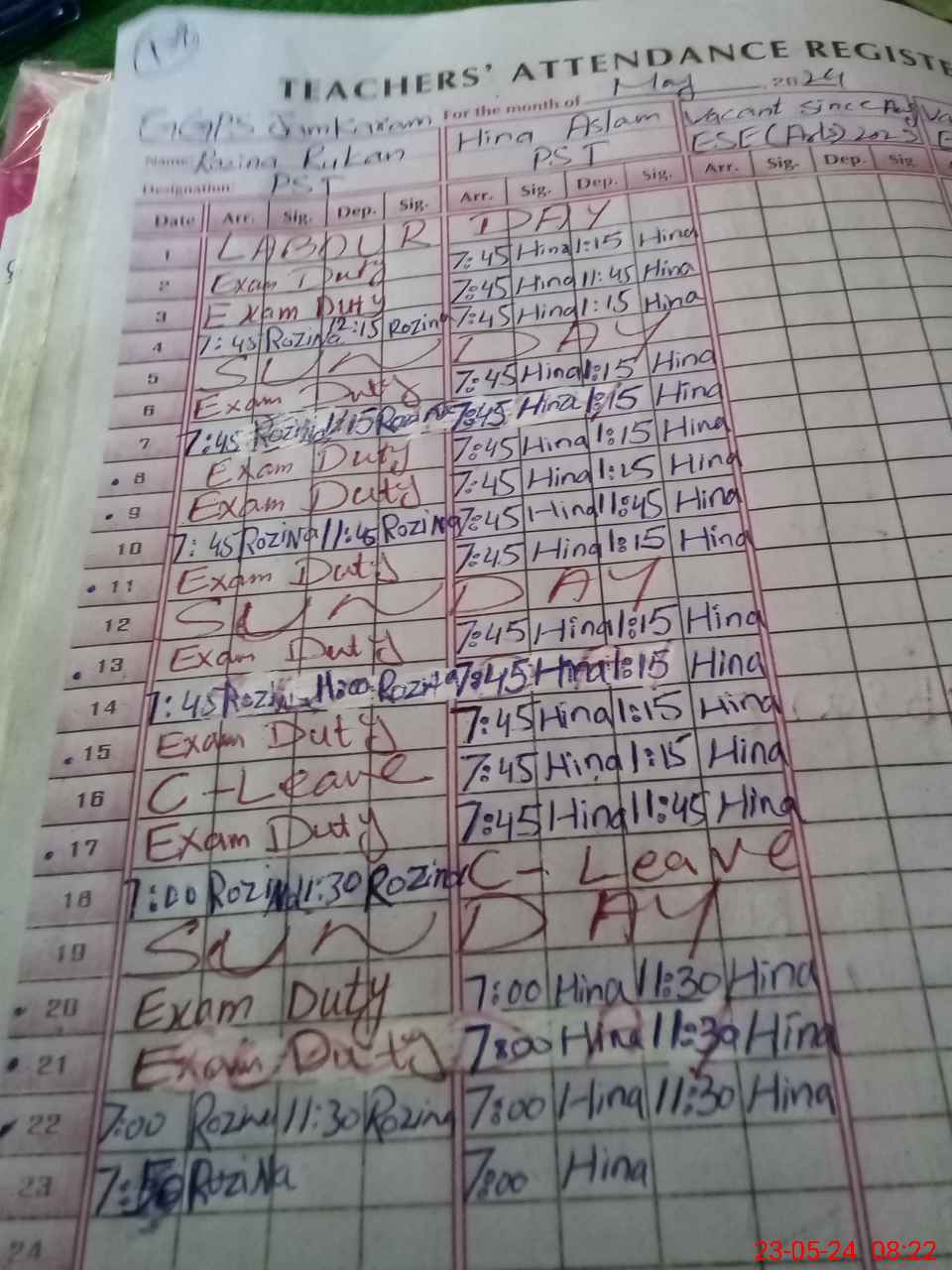 | Total no. of Classrooms: 2 No. of Classrooms Used for Teaching: 2 No. of Classrooms Storing Old Furniture, FTBs, etc: 0Comments if Any: Teacher rozina rukan come on duty at 750 consider absent as per sop Aeo not carried out last month April |