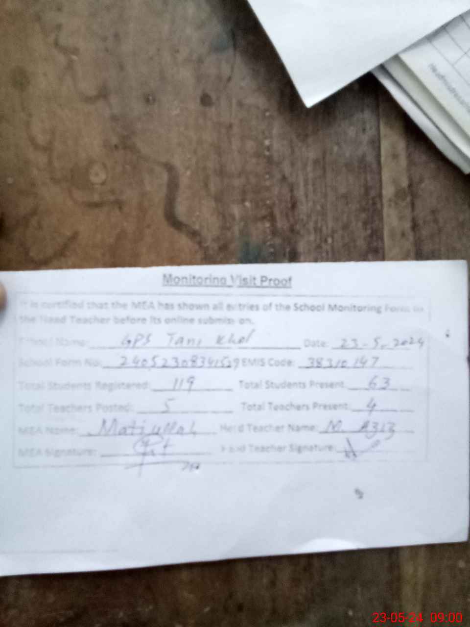| EMIS Code: 38310147 | Name of School: GPS TANI KHEL P/O KAMAR MUSHANI ISA KHEL | |||