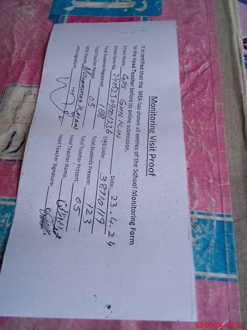 | Attendance Register | Head Teacher | MEA with School | Visit Proof |