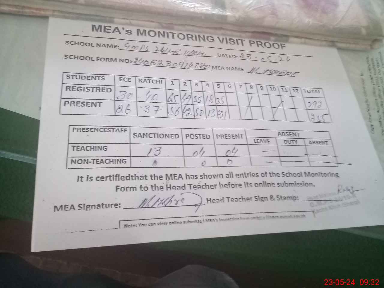 | Attendance Register | Head Teacher | MEA with School | Visit Proof |