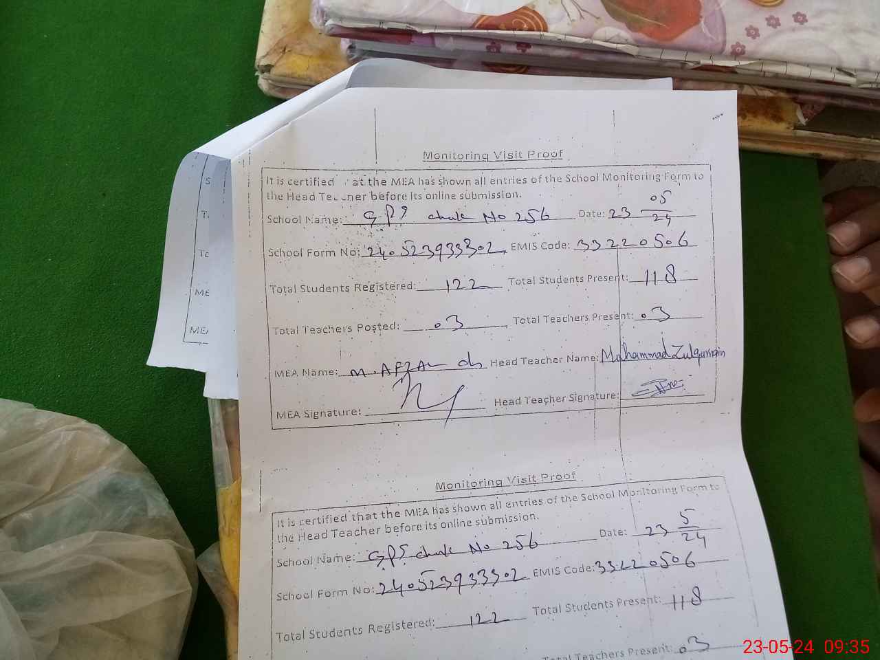| Attendance Register | Head Teacher | MEA with School | Visit Proof |