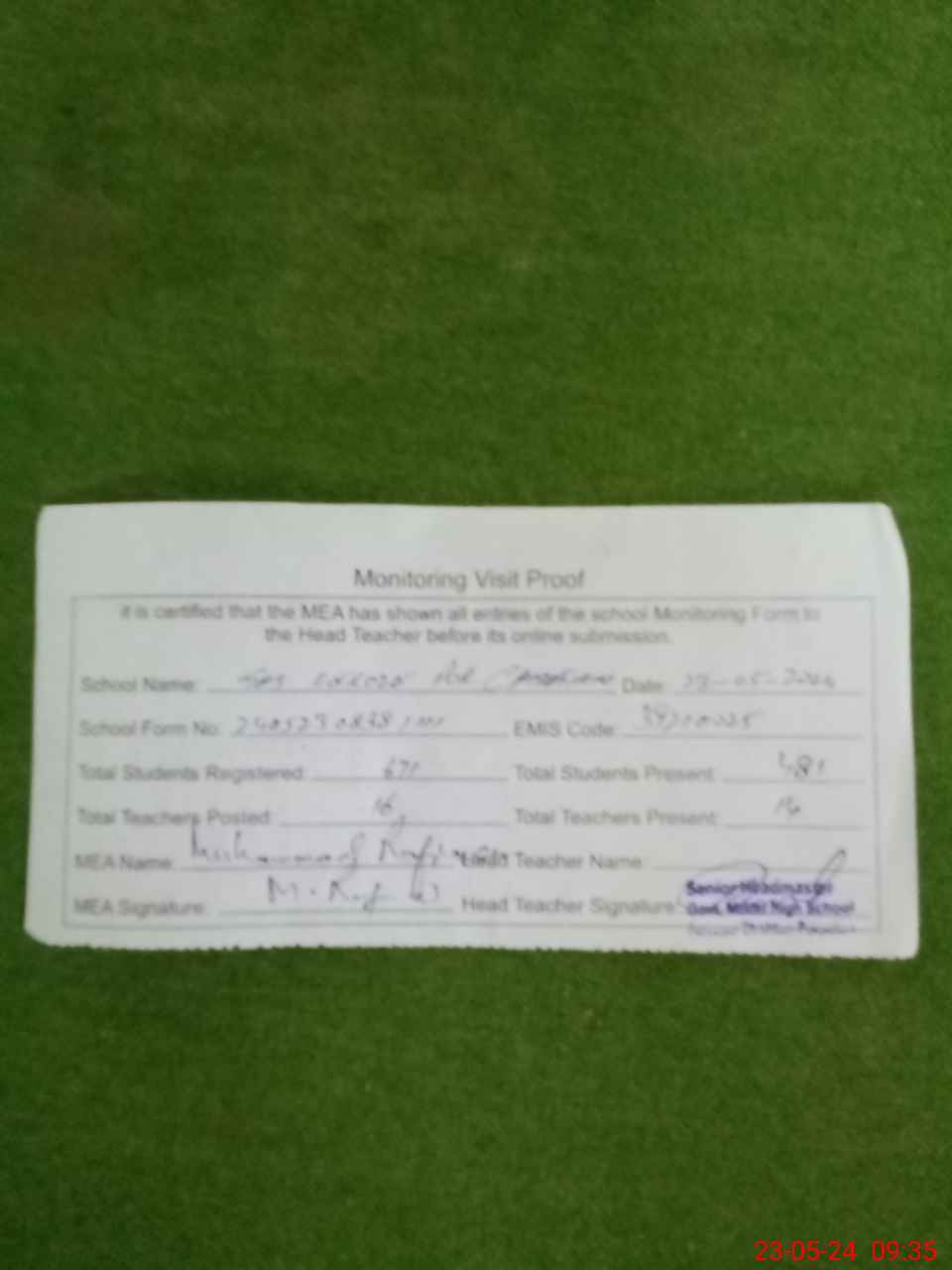 | Attendance Register | Head Teacher | MEA with School | Visit Proof |