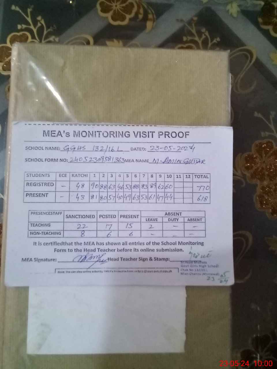 | EMIS Code: 36430104 | Name of School: GGHS 132/16-L, MIAN CHANNU | |||