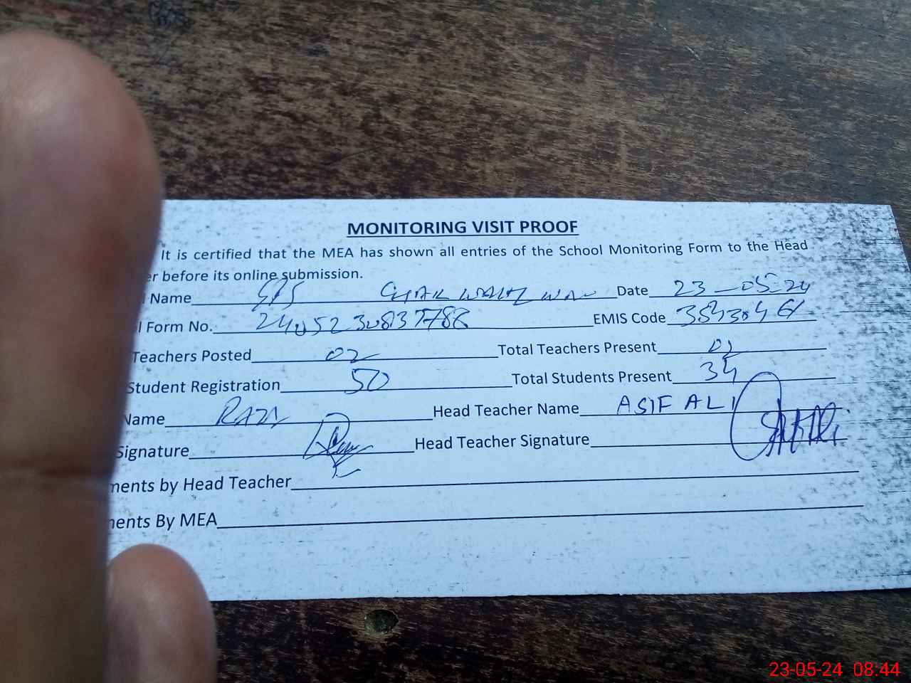| Attendance Register | Head Teacher | MEA with School | Visit Proof |
