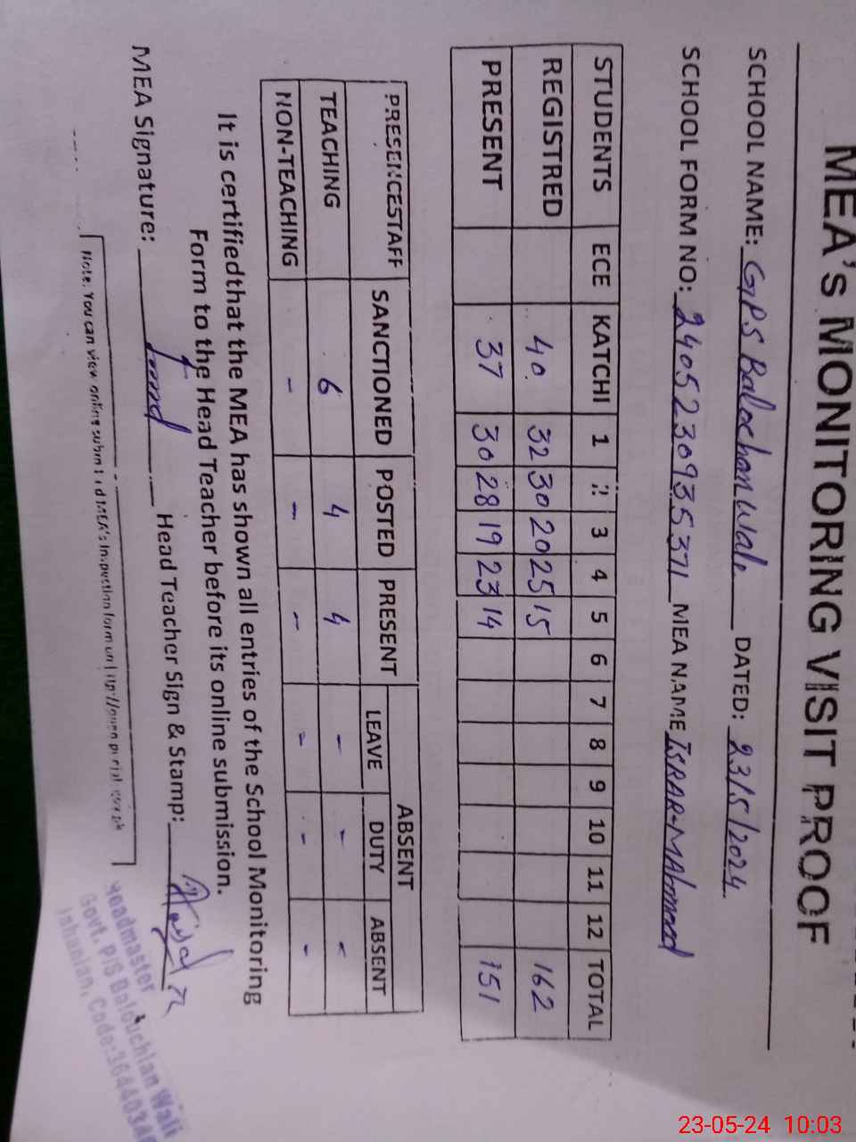 | Attendance Register | Head Teacher | MEA with School | Visit Proof |