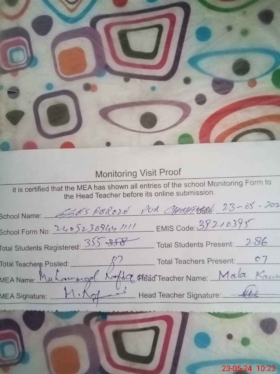| Attendance Register | Head Teacher | MEA with School | Visit Proof |