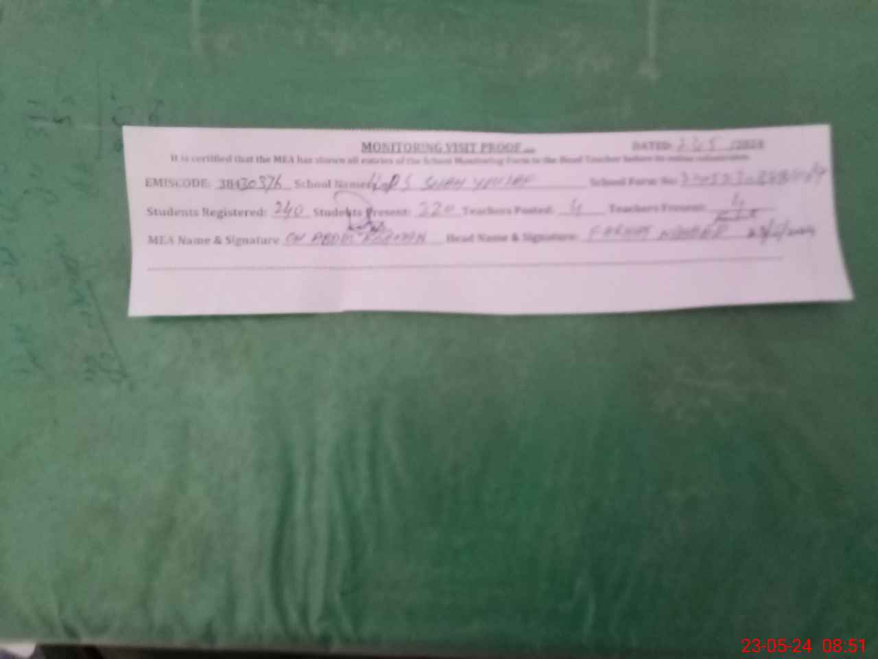 | Attendance Register | Head Teacher | MEA with School | Visit Proof |